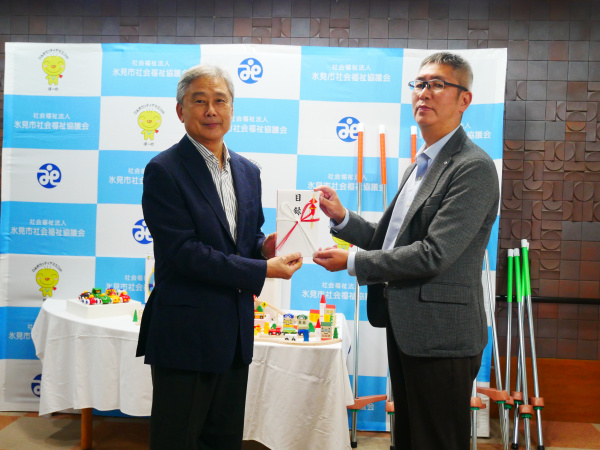 北陸労働金庫高岡支店地域推進委員会の地蔵地域常任推進委員長から、本会の髙木会長に寄付品が渡されました。