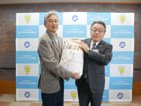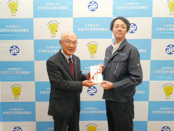 ㈱三ノ宮住設・㈱三ノ宮燃料三ノ宮常務(右)と氷見市社会福祉協議会七分常務(左)